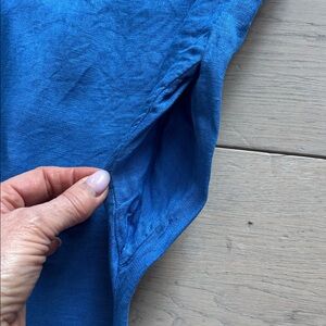 Absolutely adorable on, I purchased this last summer in an upscale shop in Collingwood. The colour is stunning. It’s so easy to wear- flowy and comfortable. Has pockets. Can be made shorter or longer by the drawstring at neck. Worn a few times, washed and hung to dry.