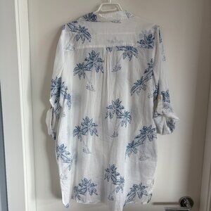 White with blue palm trees sheer linen over-sized shirt swimsuit cover-up.