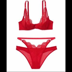 The Bras are a size 32DDD and the bottoms are a size XS they have in 2 different colours Red and Black they look exactly like in the pictures