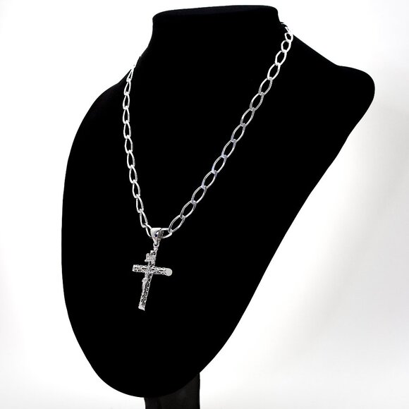 This striking crucifix pendant, meticulously crafted from genuine sterling silver (stamped 925), is more than mere metal—