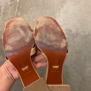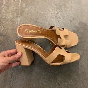Chic nude mules by INTERMIX. Sleek design with open toe. Ideal for versatile styling.