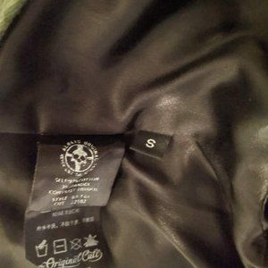 Zipper back closure. Olive drab and oxblood vegan leather vinyl with gunmetal button and chain details. Fully lined. Also available matching shirt.