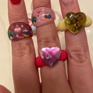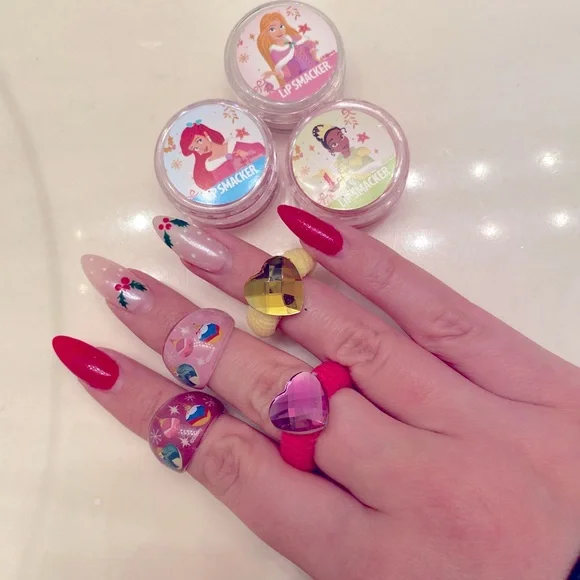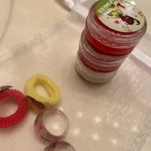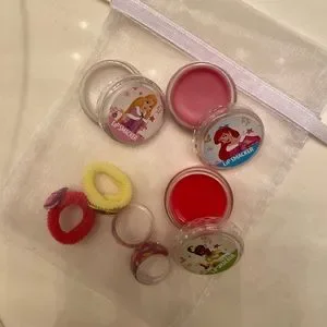 Includes 3 lip shines, 2 rings and 2 children’s hair ties. They’ve never been used, though the Tiana one’s lid got a bit cracked.