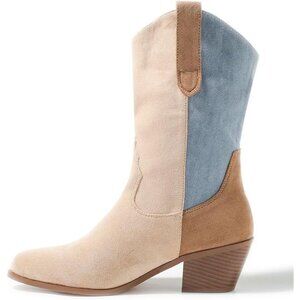 Lipijixi Women Apricot Cowboy Stacked Heel Embroider Wide Calf Cowgirl Boots