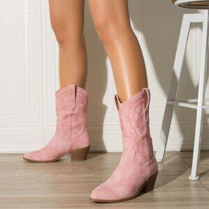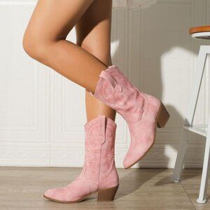 Lipijixi Women Pink Cowboy Stacked Heel Embroider Wide Calf Cowgirl Boots