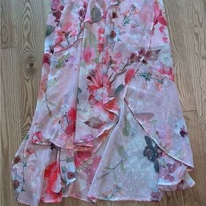Charming pink dress with floral pattern. Features delicate ruffles and a zip closure.