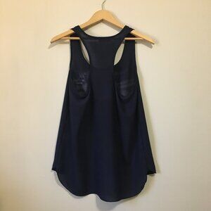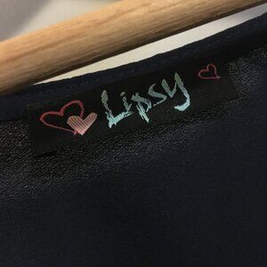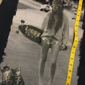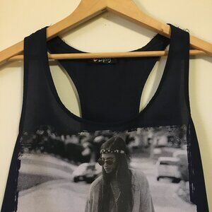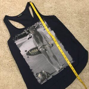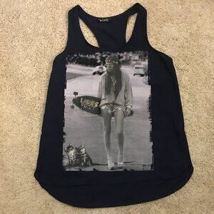 Very good preowned condition, dark navy blue/almost black, semi sheer, racerback tank top by Lipsy. Made in the EU, this tank top is so cute. Features a greyscale photo print of a skateboarder on the beach with kittens. Gold accents are used for the bling.
