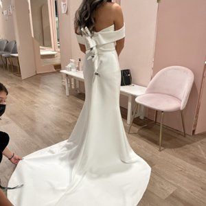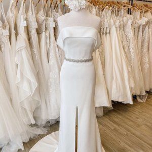 Purchased this dress for my Fall 2022 wedding but ended up going with a different dress. The dress has never been worn (other than trying it on at home) and has been kept in the garment bag. It does not come with the silver belt in the 2nd photo but does come with thin attachable straps. Tags are still intact, and the dress is unaltered.