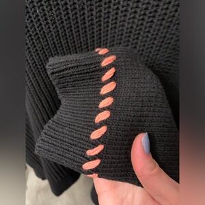 Lisa Todd ribbed knit sweater. Black with contrasting pink accent stitching, and tan/white striped sleeve. Cotton/acrylic. Boxy fit. Size medium.