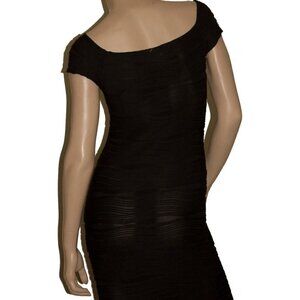 Brat Star off shoulder black fitted dress. Fabric has a sheen to it with a ripple wave pattern