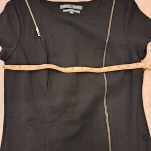 Nicole Benisti dress. Nice structured ponte fabric with stretch. Fun zipper details bring an edge to this LBD. Flattering figure hugging style. Hidden side zipper for ease of entry.