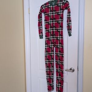 Cozy red plaid one-piece pajamas with green accents. Perfect for lounging.
