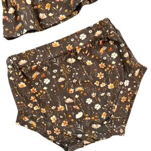 Adorable peplum baby top with matching bloomers. Features a charming fall floral pattern in orange, white, and shades of brown.
