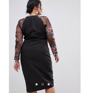 Little Mistress Plus Wrapover Pencil Dress With Embroidered Sleeve Detail
