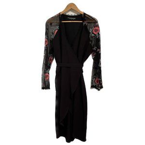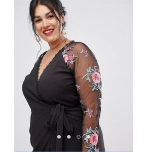 Excellent condition plus-size dress by Little Mistress. Sheer sleeves with floral embroidery, eyelash lace V-neck and cross-over front.
