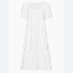 This is the perfect crisp 100% cotton dress with puff sleeves. Tiered design adds elegance. Ideal for versatile styling.