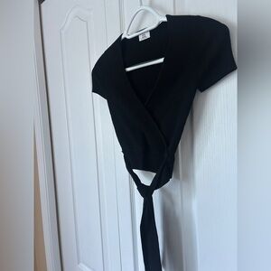 Little moon Aritzia ~ black ~ cropped wrap waist tie short sleeve ribbed Prunella knit shirt. Gently used!