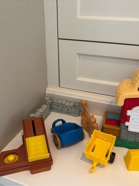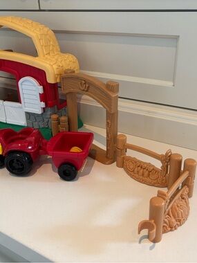 Portable Fisher-Price barn playset with handle. Comes with tractor, detachable trailer and farm accessories. Bright primary colors for engaging pretend play. Please see all pics ! Barn works when pressing down on certain items sound effects happen all pictured is included