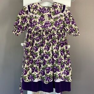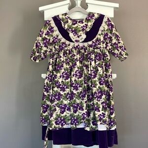 Little Princess Vintage Girls Dress Size 6. Purple grape and green leaf pattern. Cotton, purple velvet and lace with sweet purple rosette. Made in Canada!