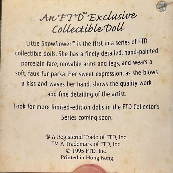 Little Snowflower Porcelain Eskimo Doll 1995 FTD Collectible Cloth Body with tag . Size 13”. Silver missing on boot