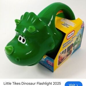 Little Tikes Glowin' Dino Flashlight, designed for children 18 months and up. It's a green dinosaur-shaped flashlight that makes a roaring sound when activated.