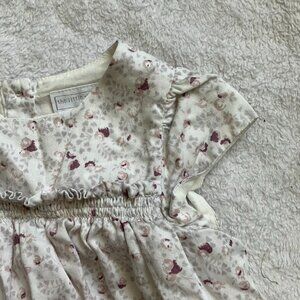 The Little White Company baby girl dress, size 3-6 months. Cream base with mauve and pink floral print, smocked empire waist, cap sleeves, and soft A-line shape. Crew neckline with back button closure. Fully lined.