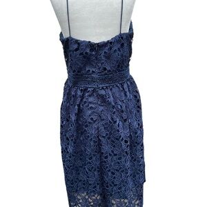 Navy Blue Cotton Lace dress by Little White Lies. Lined with lace Square neckline Spaghetti straps, Zip back fastening. Size large but fits closet to a medium, go by measurements. In beautiful pre-owned condition.