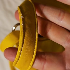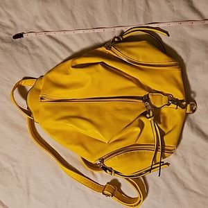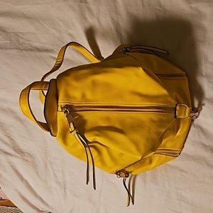 NWOT little bright yellow pleather backpack with some black edging and gold zippers and clasps. Some scuffing on the top loop as pictured.
