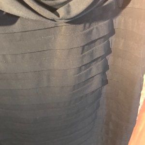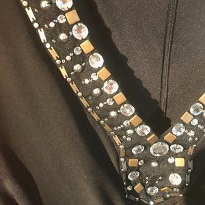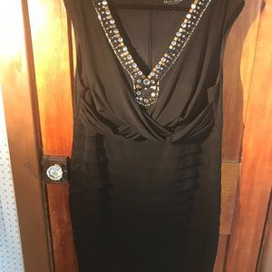 This dress has a ribbon pleat on the skirt and a criss cross bodice. The neckline is studded with crystal beading so you don't have to add a necklace if you don't want to. Really comfortable. It is made from a black polyester blend and lined. It can be gently washed and hung to dry.