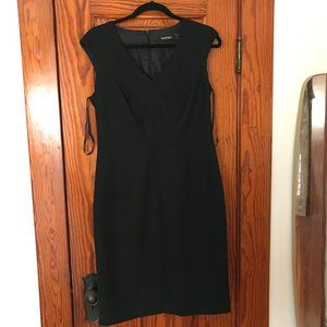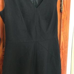 Little black dress. Interesting tailoring. Polyester with a hint of spandex. Fully lined. Invisible zipper at back.