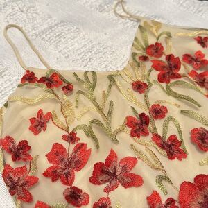 Dress to impress in this Little Moon Embroidered Floral Slip Dress! Embrace elegance with adjustable straps and red floral embroidery on a chic nude lining.