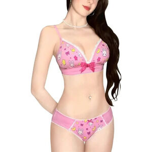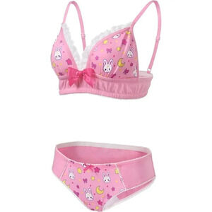 Bralette Top: Adjustable straps and 5 rows of bra clap hooks allow for a perfectly customizable fit to our ‘Usagi Moon’ patterned lingerie set embellished with bows and lace details. Panties: delicate, lacy embellishment on the leg holes with a comfort stretch elastic waistband featuring a satin bow.