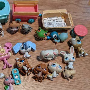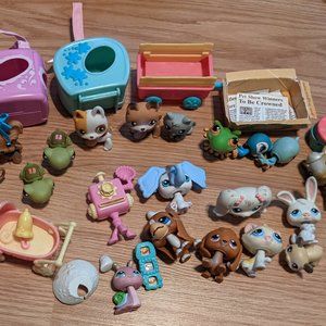 Littlest pet shop lot with accessories. They are in excellent condition, other than most of them have my initials on the paws. (JB)