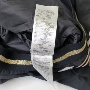 This Liu.Jo hooded jacket is a nylon sports jacket with a full zipper closure. The style features lurex® bands with gold and white stripes on the sleeves and bottom hem, a hood, and a lamé print on the back. The sleeves have a layered look, with a shorter outer sleeve and a longer inner sleeve. The overall style is a blend of sporty and chic.