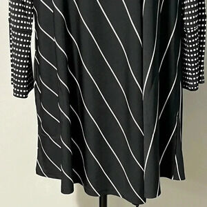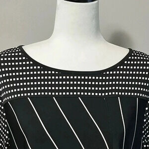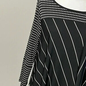 Like new condition. Soft stretch material. Square dotted pattern with stripes. Rounded neckline. Angled hem. 3/4 length sleeves.