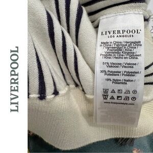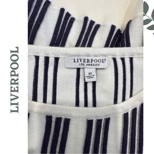 This Liverpool striped sweater brings effortless polish to any wardrobe. Featuring a navy and cream vertical stripe design with full sleeves and a relaxed fit, this knit top pairs beautifully with jeans (try red!), trousers, or skirts for a timeless look. The lightweight material makes it a perfect layering piece for spring through fall, and the wide neckline adds a flattering, feminine touch.