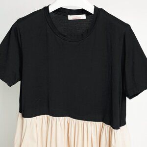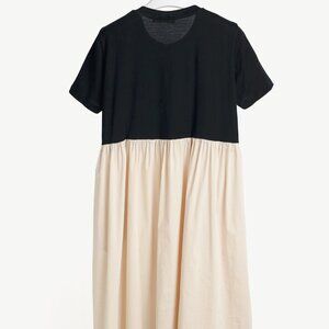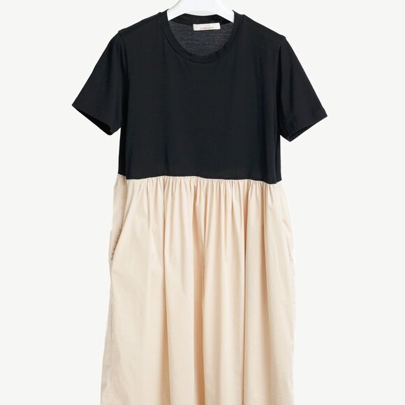 Made in Italy, this t-shirt dress from Liviana Conti circa 2019 is crafted in a black cotton jersey on the bodice, and a beige cotton poplin on the skirt. It features short sleeves, a round neck, side-seam pockets, a gathered waist, and a midi-length skirt.