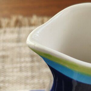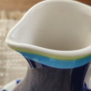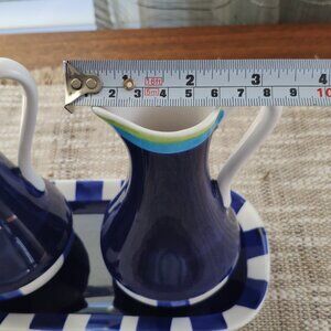 Table Service Set of 3, including Two small Ceramic Pitchers and Plate, Cream and Milk, or Oil and Vinegar Set, from Living Art Stoneage Hand Painted, by Carleen Gaby. Cobalt Blue and White, with Turquoise and Lime trim on Pitchers. Pitchers are 5.5 inches in height and 3.5 inches in diameter at their widest, Plate is 8.5 inches in length and 4.25 inches in width. Plate has production faults repairs on the rim, shown in pictures. Very Good Vintage condition, no chips, no cracks, light wear marks hardly visible, Please see pictures for further details