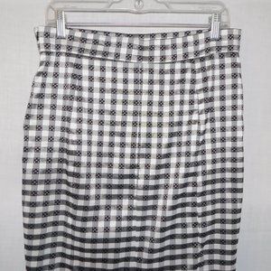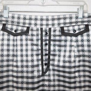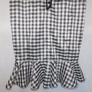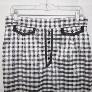 This beautiful Womens XL Living Dead Souls Black White silver detail Gingham Check Pencil skirt with ruffle hem is in great clean bright condition. Skirt is is a polyester spandex blend - machine wash cold - air dry. Skirt is lined down to the top of the bottom Ruffle. Features side Zipper, 2 faux front pockets and faux front button fly. Back features bottom center 9" Slip from base of ruffle.