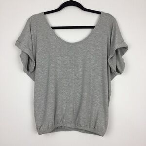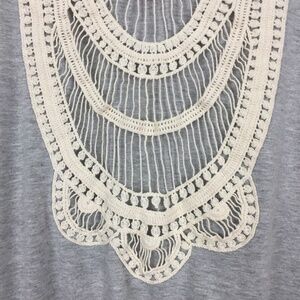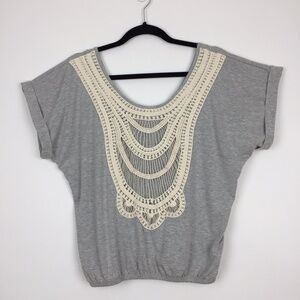 Women's Size Medium. Polyester / rayon / spandex. Light gray. Crochet yoke front detail. Scoop Neck. Dolman sleeve with rolled cuffs. Elastic waist.