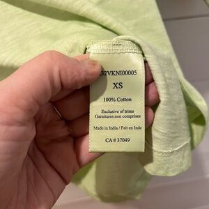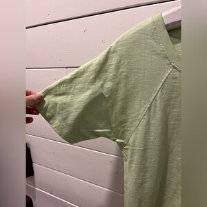 T-shirt doux vert pâle à manches courtes, encolure ronde et ourlet arrière à finition brute. Look décontracté et minimaliste. Excellent état.