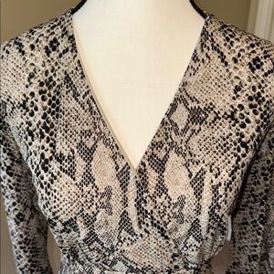 Stylish snake print blouse. V-neck design. Long sleeves. Perfect for any occasion. Has stretch.