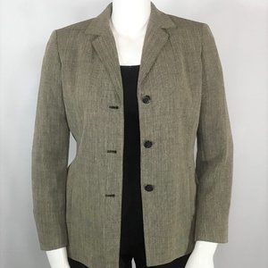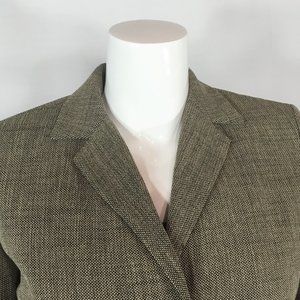 Very good condition. Fitted lightweight jacket in a fabric that drapes really nicely. Front reese pockets, princess seaming. Fully lined. Slits at sleeve cuffs. Tan and black weave. (Note: The mannequin is very tall so her arms are longer than average; the sleeves are a normal length for a petite.)