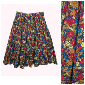 Vibrant floral A-line skirt. Features a bold red belt. Perfect for a stylish look.
