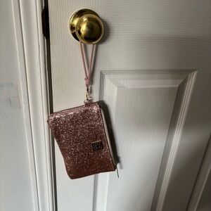 Glittery pink wristlet with phone charger inside, brand new without tags, water resistant material