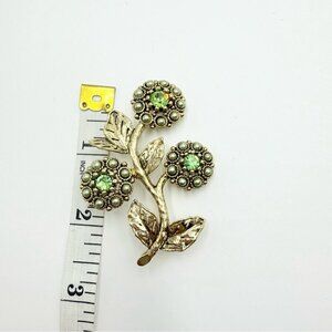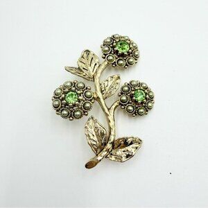 Liz Claiborne Green Rhinestone Seed Pearl Flower Spray pin brooch Gold Tone LC
