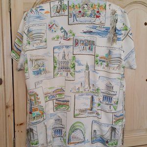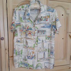 Vintage Liz Claiborne Ivory All Over Graphic Print Short Sleeve Silk Blouse Size Lg