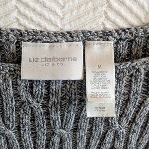 Liz Claiborne sweater, Liz & Co pullover, vintage cable knit, metallic thread sweater, cozy glam, grey knit sweater, cotton acrylic blend, wide neckline sweater, fall fashion, winter layering, holiday sparkle, vintage medium sweater, classic knitwear, retro style, Y2K cozy