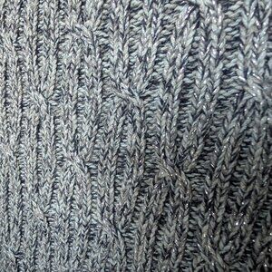 Liz Claiborne sweater, Liz & Co pullover, vintage cable knit, metallic thread sweater, Silver, cozy glam, grey knit sweater, cotton acrylic blend, wide neckline sweater, fall fashion, winter layering, holiday sparkle, vintage medium sweater, classic knitwear, retro style, Y2K cozy