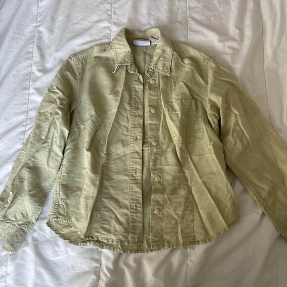 I love this top! I would keep it if it was just a little bigger. Kind of an off-yellow/green/champagne colour. Petite size 4, but fits S-M depending on desired fit.